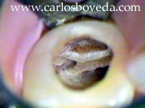 Root canal treatment of an invaginated maxillary lateral incisor with a C-shaped canal Carlos Bóveda, Od* / Mariela Fajardo, Od MS** / Beatriz Millán, Od*** * Attending Professor, Endodontics Department, Universidad Central de Venezuela, Caracas, Venezuela. Private Practice, Caracas, Venezuela ** Chief Graduate Endodontics, Universidad Central de Venezuela. Private Practice, Caracas, Venezuela *** Private Practice, Caracas, Venezuela The endodontic treatment of an atypical maxillary lateral incisor that contained a c-shaped root canal is presented. The unusual anatomic configuration of this particular tooth and the advantage of using image magnification to facilitate endodontic treatment are discussed. (Quintessence Int 1999;30:707-711) The fact that the maxillary lateral incisors generally present a single root and a single canal led in the past to the belief that this is the only anatomical possibility. 1,2 However, case reports 3- 11 have shown that these teeth may present different anatomic configurations, including the dens invaginatus , also known as the dens in dente. The anomalous development in these teeth varies from a simple coronal groove to a sac that extends beyond the cementoenamel junction all the way down to the apex, forming a second foramen.12 The prevalence of this anomaly may be higher than generally believed; reported frequencies vary up to 10%.13 Cases of dens in dente are known to be treated surgically,14 although non surgical root canal treatments have also reported to be successful.11,15 These procedures were performed in teeth with single or multiple canals. However, the internal shape of these canals has never been described, even though radiographic analysis and results suggest strong differences between these canals and the common conical configurations. The present case report describes the endodontic treatment of an invaginated maxillary left lateral incisor with 3 canals, 1 of which was a C-shaped canal.